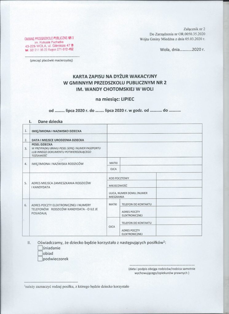 WNIOSEK O ZORGANIZOWANIE OPIEKI W PRZEDSZKOLU: