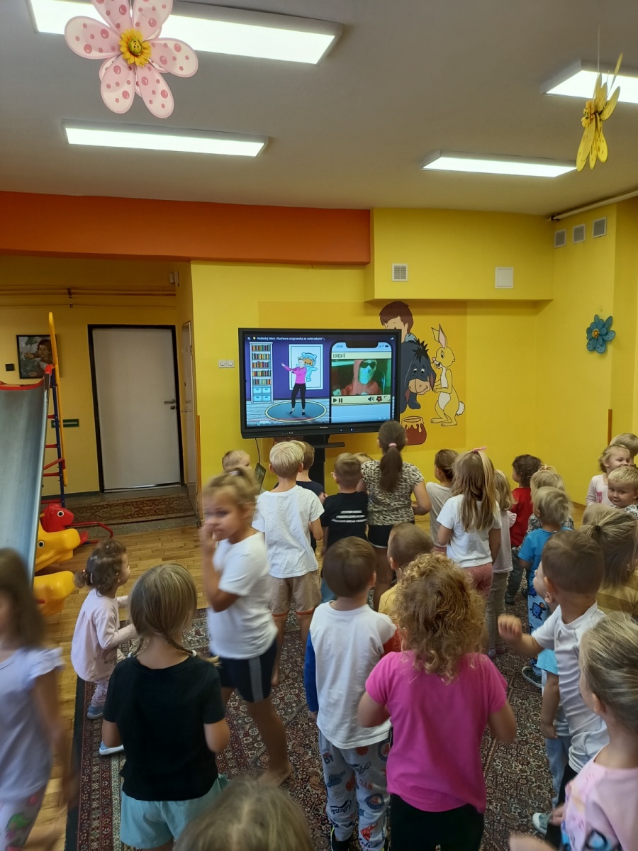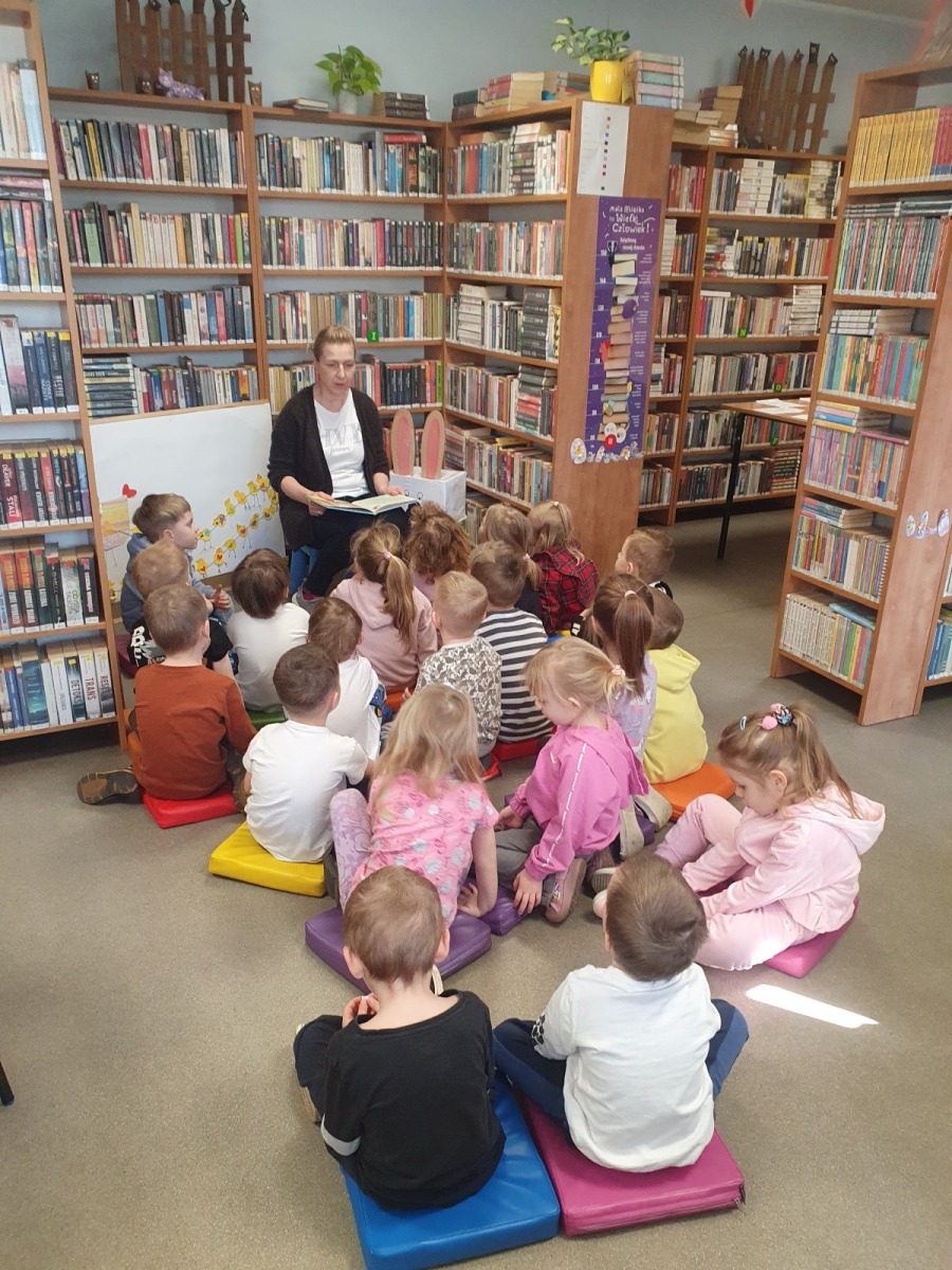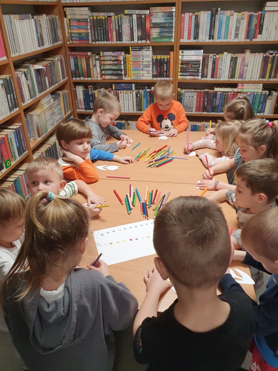 Dzisiaj odwiedziła nas pani bibliotekarka. Dzieci wysłuchały bajki o przygodach Misia Tulisia. Ponadto, pani bibliotekarka zaprezentowała wszystkim dzieciom kolejną edycję akcji czytelniczej „Mała książka – Wielki człowiek” . Ze względu na sytuację epidemiczną, spotkanie odbyło się w pełnym reżimie sanitarnym.