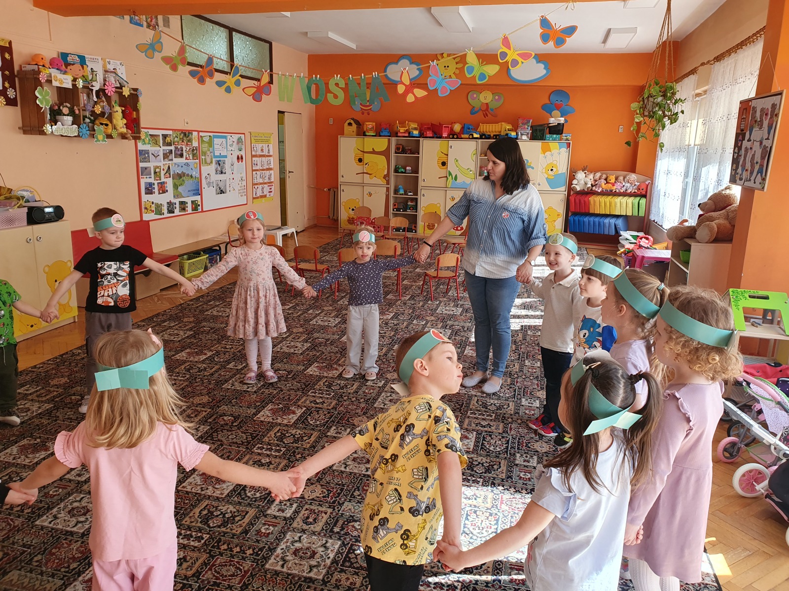 Pierwszy dzień wiosny nasze przedszkolaki uczciły kolorowym korowodem wiosennym.