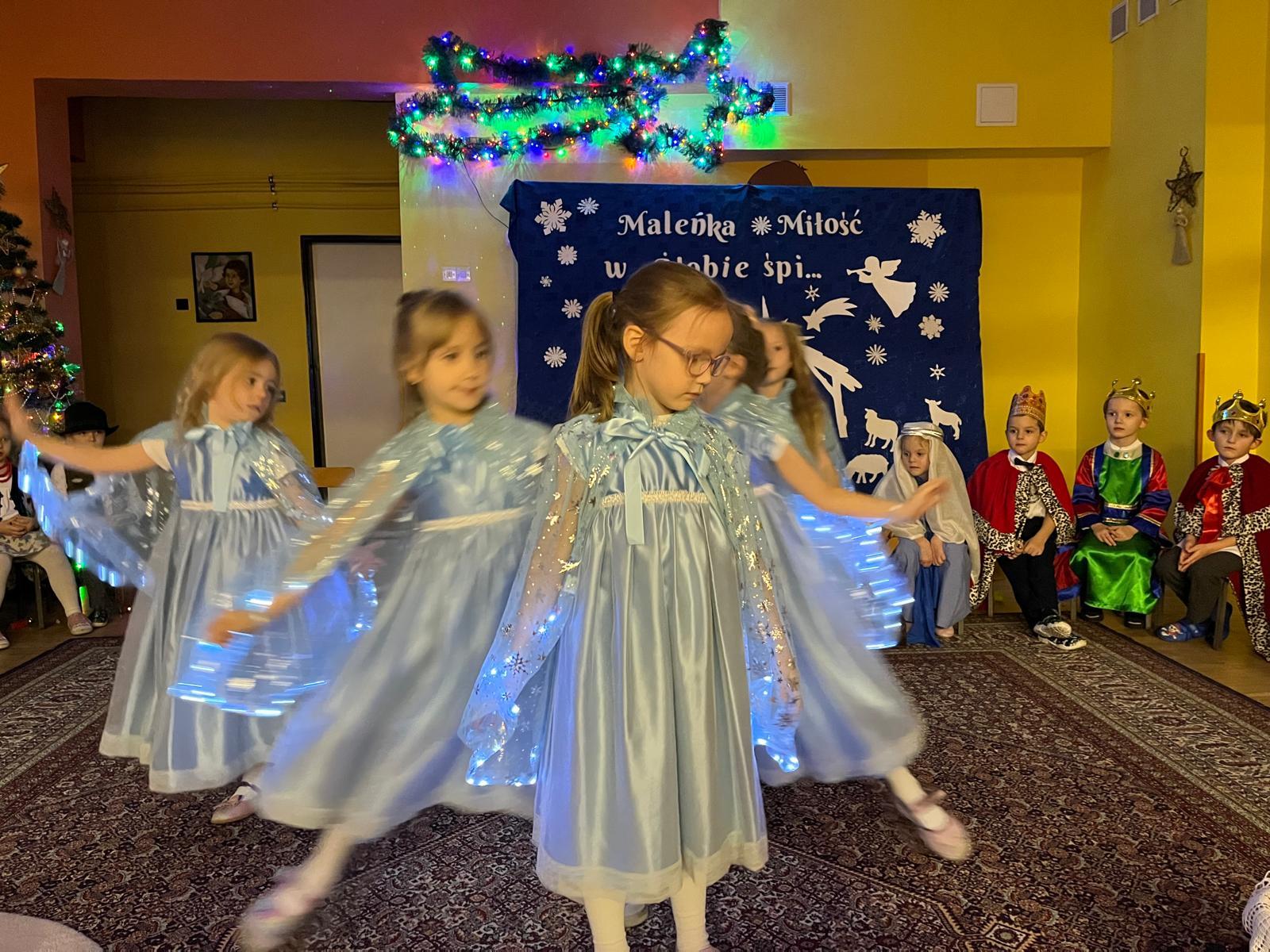 W dniach 16.12, 17.12. oraz 18.12.2025 w godzinach wieczornych odbyły się w naszym przedszkolu wyjątkowe uroczystości – jasełka. Dzieci z grup Kangurki, Króliczki oraz Tygryski zmieniły się w najświętszą rodzinę, aniołków, królów i pastuszków, gwiazdeczki, góralki, przenosząc wszystkich obecnych w czasy sprzed dwóch tysięcy lat. Mali artyści z dużym przejęciem odtwarzali swoje role i z radością śpiewali kolędy i pastorałki. Hol przedszkola wypełnił się najważniejszymi dla dzieci gośćmi – rodzicami, rodzeństwem, dziadkami, którzy ze wzruszeniem spoglądali na swoje pociechy.