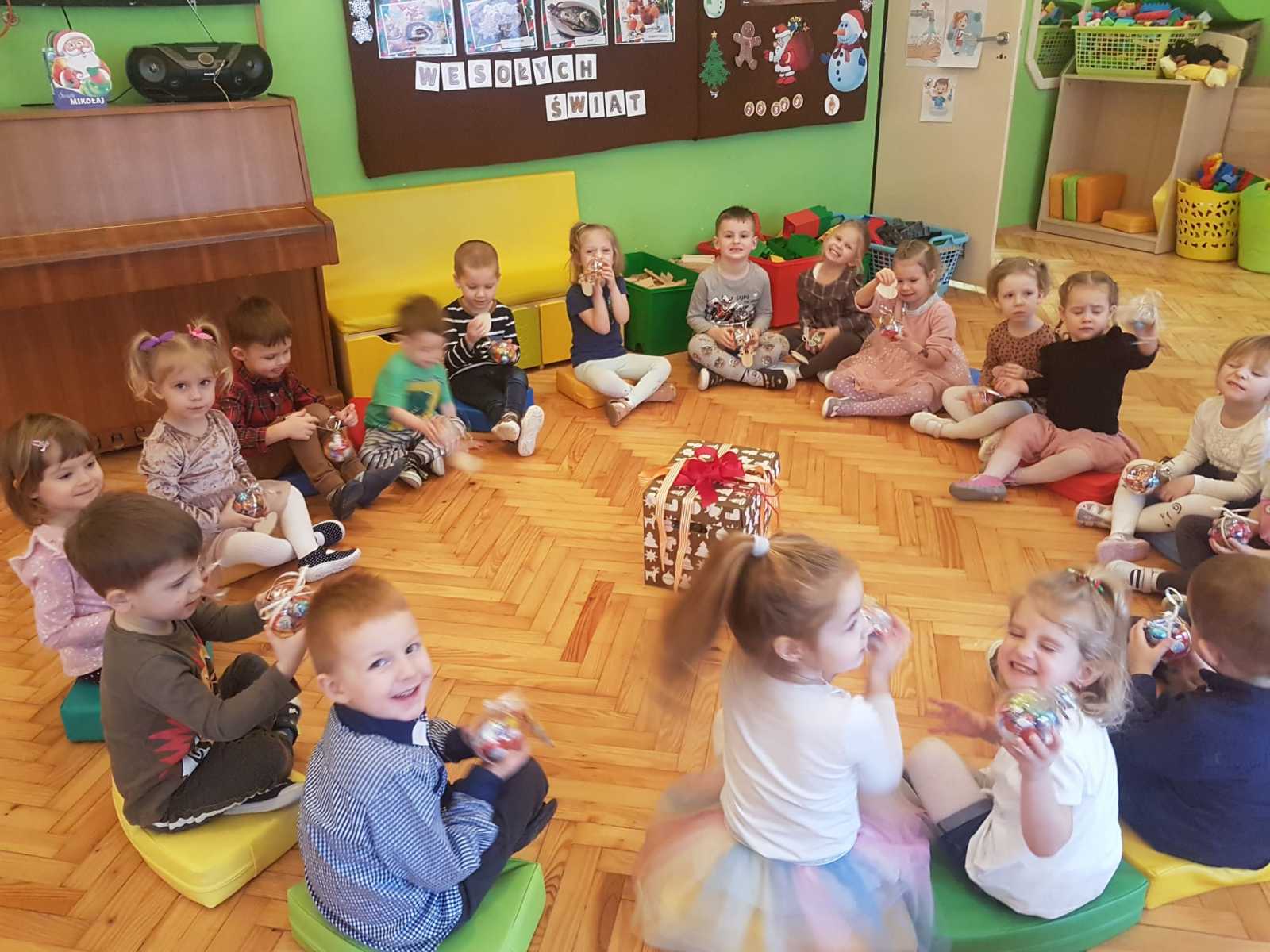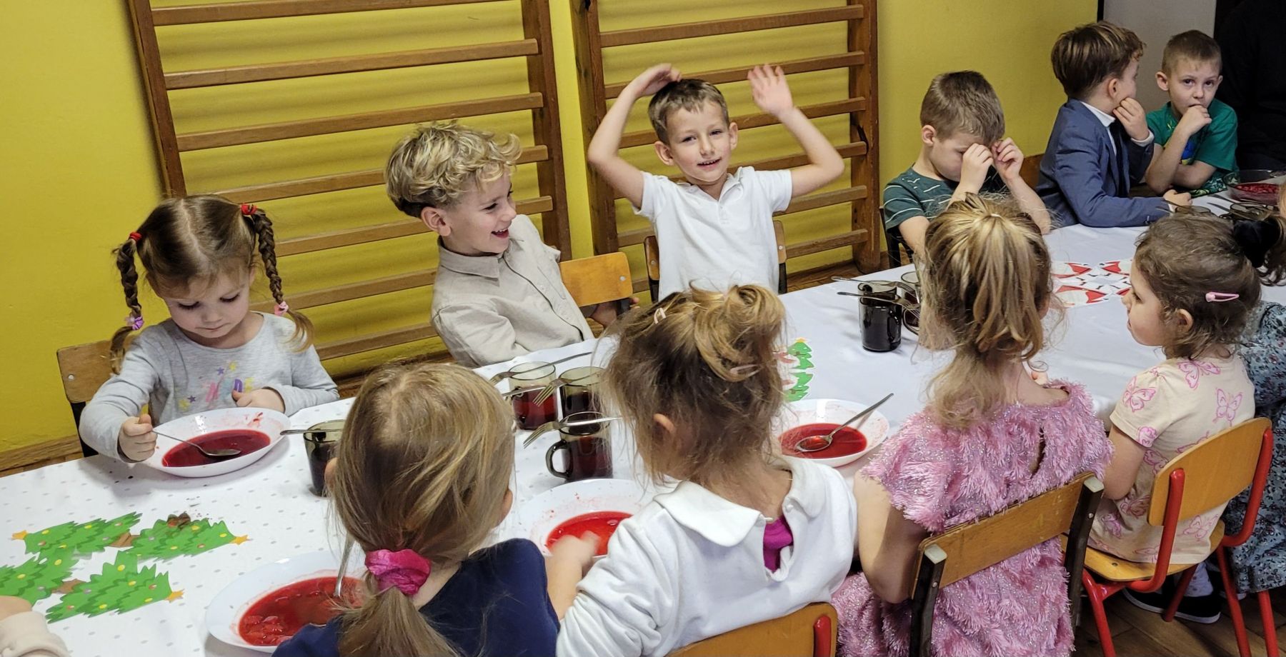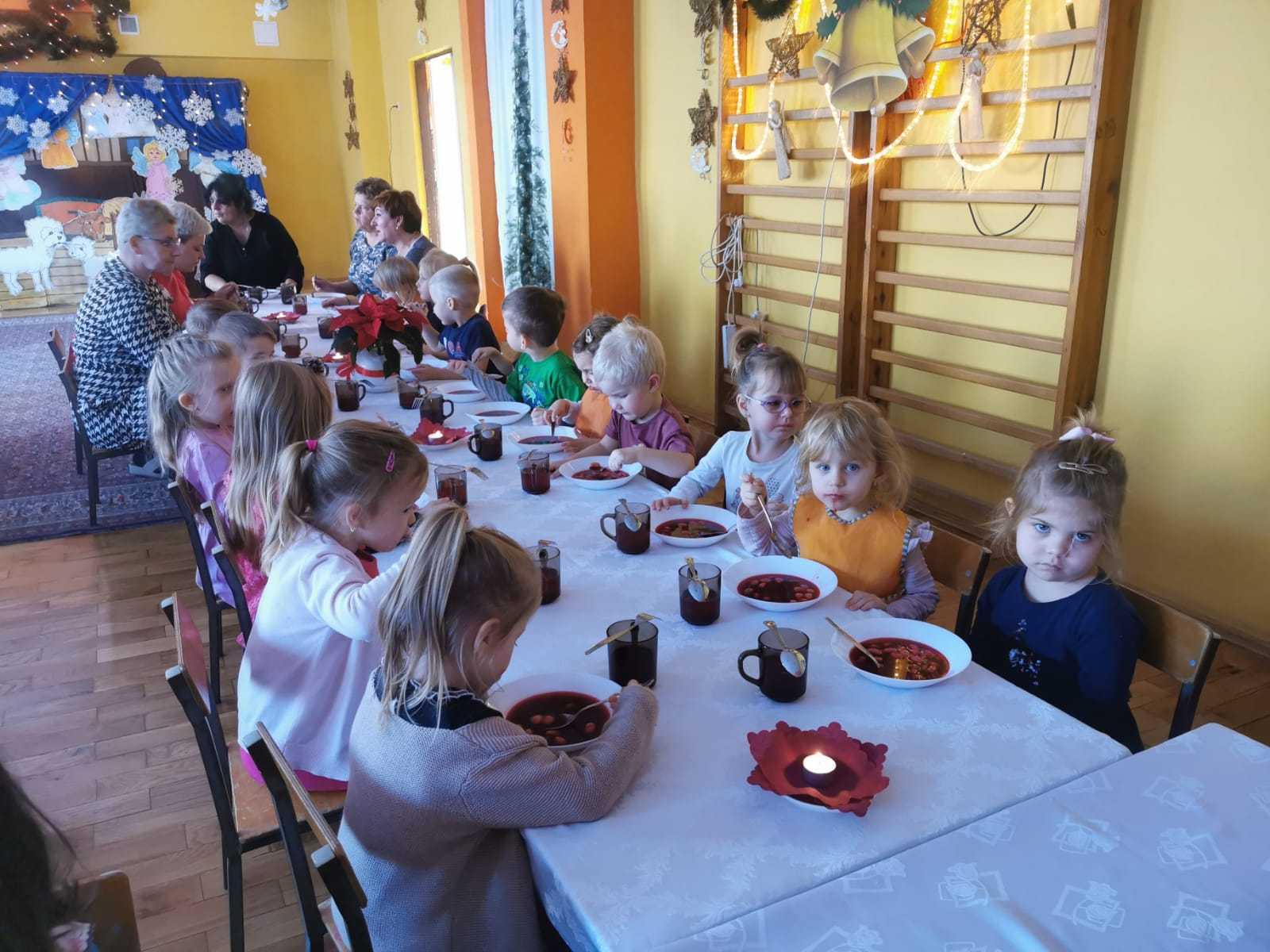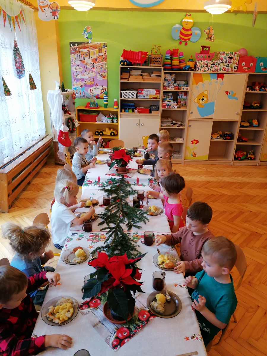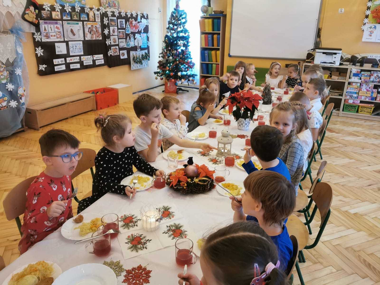 W piątek 20 grudnia odbyła się uroczysta wigilia. W tym dniu wszystkie dzieci, nauczyciele i pracownicy administracyjno-obsługowi spotkali się przy świątecznym stole. Było kolędowanie, łamanie się opłatkiem oraz wigilijny obiad. Biesiadnicy smakowali barszczyk z uszkami, rybkę i inne smakołyki. Wspólne świętowanie wprowadziło zebranych w radosny nastrój oczekiwania na święta Bożego Narodzenia.